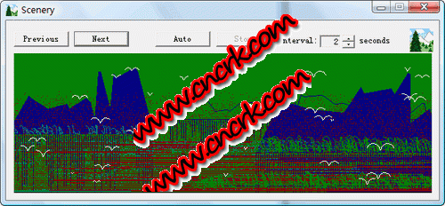 一個簡陋的隨機風景畫生成程序,每次運行都會出現(xiàn)不同的結(jié)果。點擊“Next”顯示下一幅畫,點擊“Previous”顯示上一幅。點擊“Auto”,將按照“Interval”設置的秒數(shù),自動顯示下一幅。