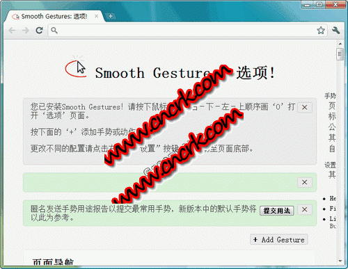Chrome瀏覽器下運(yùn)行的一個(gè)好用的鼠標(biāo)手勢(shì)擴(kuò)展。Smooth Gestures功能十分強(qiáng)大,提供了多達(dá)19種常用操作,可以選擇使用的鼠標(biāo)按鍵,而且可以完全按照您的需要來(lái)定制所有的手勢(shì)。Smooth Gestures還有一點(diǎn)比同類擴(kuò)展好的是可以在所有平臺(tái)上使用(前面發(fā)行的擴(kuò)展大多數(shù)無(wú)法在Linux下使用)。
