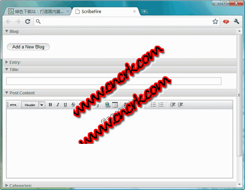 ScribeFire是火狐瀏覽器上非常著名的一個(gè)全功能的博客編輯器,整合于您的瀏覽器之中,并使您很簡(jiǎn)便的發(fā)布博客。它可以讓你在不登錄Blog后臺(tái)的情況下直接撰寫(xiě)博客并發(fā)布,并且支持絕大部分博客類(lèi)型?,F(xiàn)在,該插件終于有了適用于Chrome的版本。