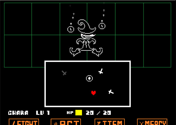 戰(zhàn)斗方框:如果敵人選擇攻擊你(不論你是否選擇主動(dòng)攻擊),在屏幕下方會(huì)出現(xiàn)一個(gè)方框,玩家操控這個(gè)心形對(duì)方框的圖案進(jìn)行躲避,一旦被觸碰就會(huì)受到傷害,某類(lèi)特殊圖案即便是觸碰了也不會(huì)受到傷害(如骷髏的藍(lán)光)。