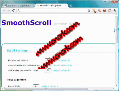 谷歌瀏覽器平滑滾動插件 V0.6 英文官方安裝版 Chrome基于Webkit瀏覽器引擎運行,而使用Webkit引擎瀏覽器的一大“特點”是滾動網(wǎng)頁時不夠平滑,看上去總是有些延遲。這個插件可在Chrome瀏覽器中實現(xiàn)平滑滾動,安裝后,無論你使用鼠標(biāo)滾輪還是鍵盤方向鍵或翻頁鍵,都可以看到平滑滾動效果了