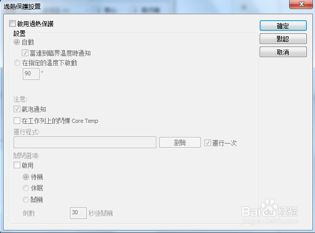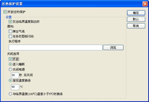 在最上排菜單<選項(xiàng)>-<過熱保護(hù)>中,可以設(shè)定溫度過高時的保護(hù)措施,可以選擇告警或重啟。
