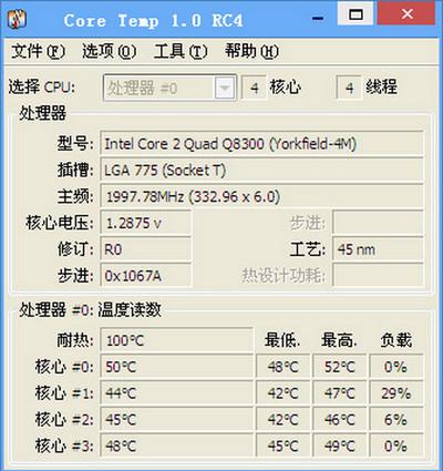 Core Temp的出色體現(xiàn),它顯示了 PC中每個處理器中每個核心的溫度。加載CPU時,Core Temp可以讓您觀察CPU加載時實(shí)時溫度的變化。該程序的運(yùn)行方式就是完全獨(dú)立于主板。