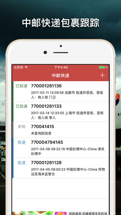 澳洲中郵快遞運(yùn)單跟蹤:方便地跟蹤您的中郵快遞運(yùn)單。內(nèi)置條碼掃描器:讓快遞跟蹤號(hào)錄入更快速、省時(shí)省力。
