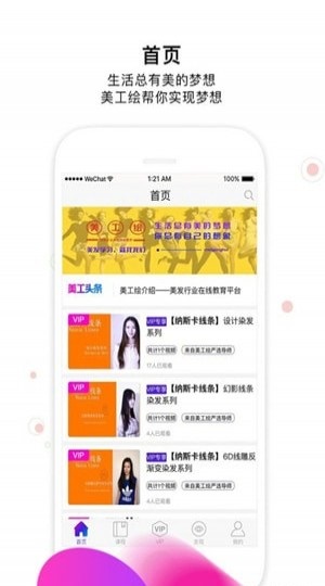 首頁:生活中有美的夢想,美工繪幫你實現(xiàn)夢想;課程:來自美工繪嚴選導師推薦,造型、剪發(fā)、燙發(fā)、全面覆蓋;