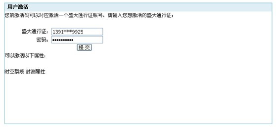 輸入您的盛大通行證及賬號密碼并點擊提交。注:一個激活碼只能使用一次,即只能激活一個賬號。