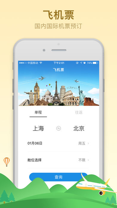 3.飛機(jī)票:全國(guó)各大航空公司航線合作,瞬間出票,一手機(jī)票合作商。為您的航空之旅提供便捷服務(wù),全場(chǎng)底價(jià)促 銷(xiāo),訂機(jī)票上游大大,手機(jī)自動(dòng)值機(jī),提前預(yù)約選座;低價(jià)助手讓你天天低價(jià)訂購(gòu)機(jī)票,保證優(yōu)質(zhì)的服務(wù)體驗(yàn)