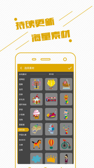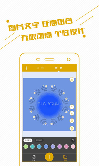 “拼”模塊中,6種比例圖文混排,77種字體隨心選擇,復(fù)制/圖層順序切換/圖層鎖定,純色背景與圖片背景填充