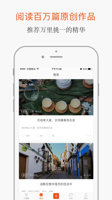 【原創(chuàng)保護(hù)】- 數(shù)百萬作者首選的寫作軟件和發(fā)布平臺(tái),全力支持并保護(hù)原創(chuàng)內(nèi)容,每個(gè)人都能擁自己的獨(dú)家專欄,每篇作品都可有圖片水印、超有設(shè)計(jì)感的原創(chuàng)標(biāo)注。【粉絲推送】- 作品可以一鍵分享微信朋友圈,推送到好友動(dòng)態(tài),還可以投稿到各種興趣圈、上頭條,讓你的每篇原創(chuàng)美文、美片和美拍輕松傳播到千萬粉絲、贏得贊賞和關(guān)注。