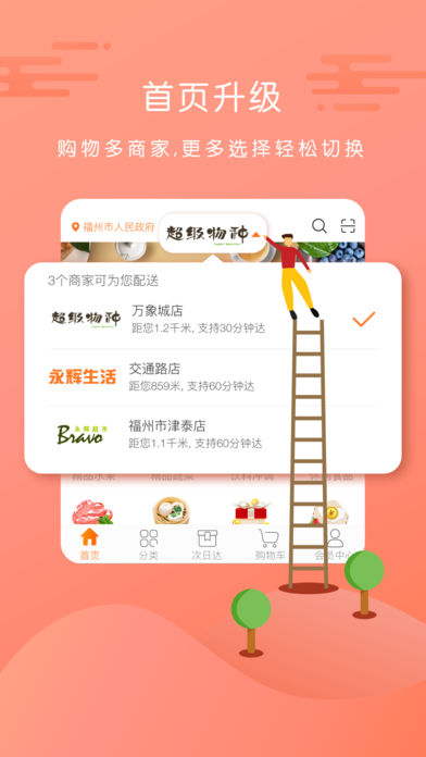 3、 集優(yōu)選水果、時令鮮蔬、禽魚肉類等數(shù)十種商品分類、海量商品任您挑選。