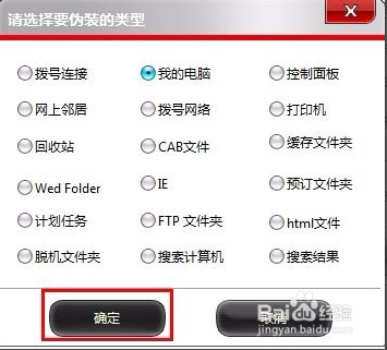 在彈出的“請(qǐng)選擇偽裝類型”的窗口中,選擇文件夾偽裝類型,然后點(diǎn)擊“確定”。這樣偽裝文件夾就完成了。