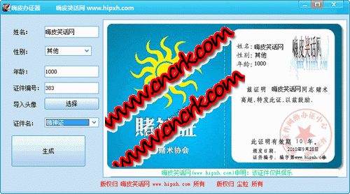 可以制作出搞笑 雷人的證件 可以制作的證件有:光棍證,聊天許可證,美女證.等等 該程序金供娛樂. 版權(quán)歸 嗨皮笑話網(wǎng)