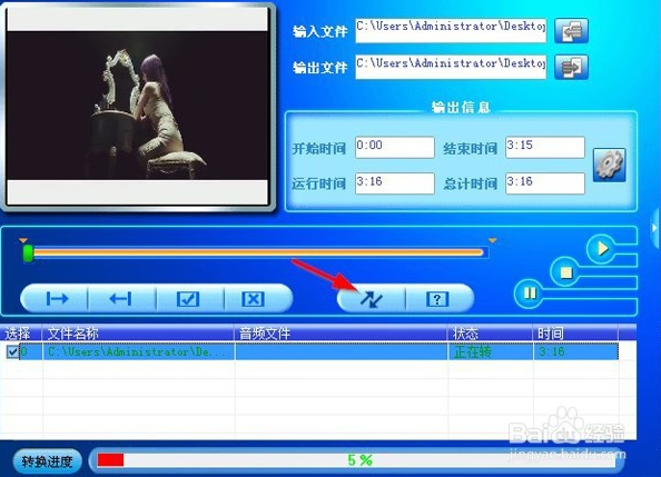 單擊下方“播放”小圖標,試行導(dǎo)入視頻,無誤,此時能看到“齒輪”圖標由灰色變藍,單擊可進入更改選項,確認轉(zhuǎn)換屬性后,確定返回,然后單擊“斜雙箭頭”如下圖:
