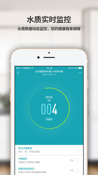 通過(guò)手機(jī)App查看云米超能凈水器等智能設(shè)備的信息,實(shí)時(shí)監(jiān)控家中自來(lái)水的水質(zhì)情況、凈化后的水質(zhì)情況、用水水量、水溫狀態(tài)和濾芯壽命等動(dòng)態(tài)數(shù)據(jù)