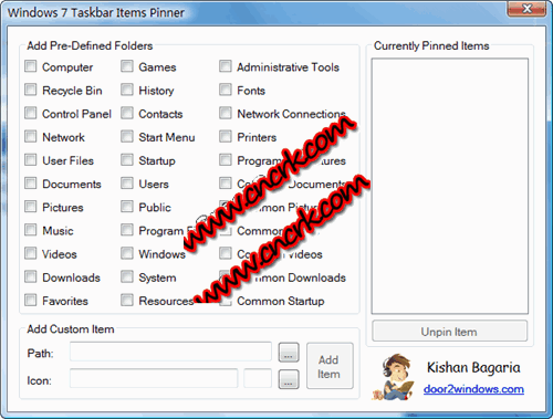 Windows 7 Taskbar Items Pinner V1.0 英文綠色免費(fèi)版 Windows7的任務(wù)欄默認(rèn)只能添加EXE,如果添加文件夾會(huì)集成到庫(kù)里面去,Windows 7 Taskbar Items Pinner小工具能在任務(wù)欄添加任何文件夾,默認(rèn)可以添加計(jì)算機(jī),我的文檔,音樂(lè)目錄,下載目錄,開(kāi)始菜單,回收站,系統(tǒng)工具,等等!或者可以自己自定義添加文件夾