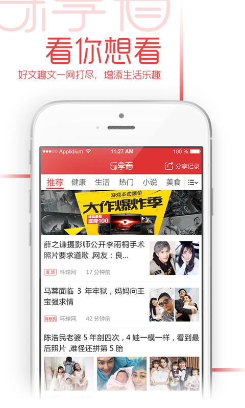 樂享看,一個新奇有趣的文化傳播平臺。從突發(fā)新聞到時事、社會趣聞、搞笑段子、精彩圖集,隨時隨地看好文,盡情分享給好友~
