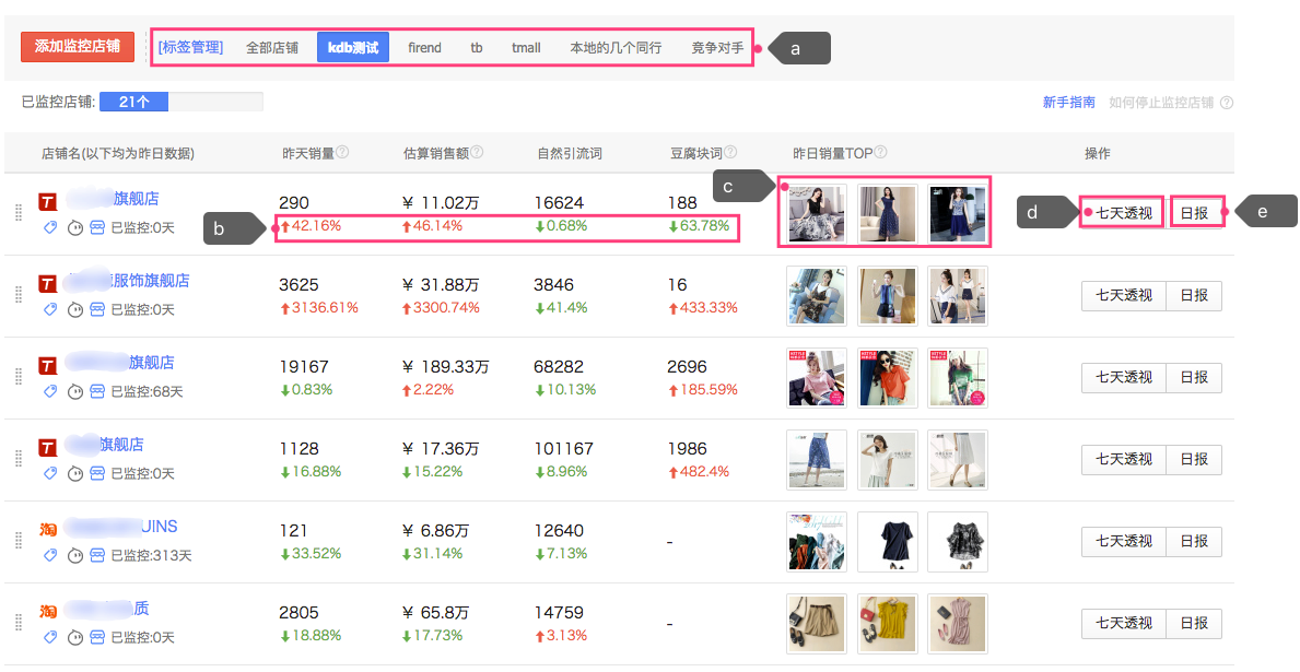使用「店鋪管理」來管理那些被你監(jiān)控的店鋪;在店鋪管理頁面,你可以添加、刪除你的監(jiān)控對象,還可以查看監(jiān)控對象昨日的數(shù)據(jù)概覽。