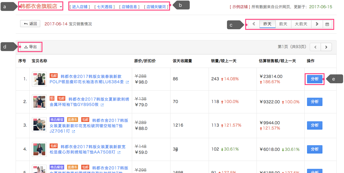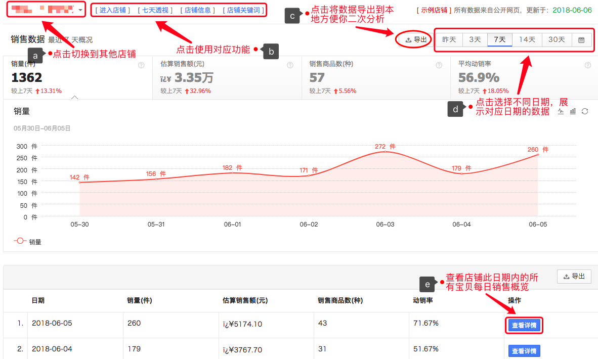 e.查看詳情,查看指定日期此店鋪所有「寶貝每日銷售概覽」(下面有介紹)