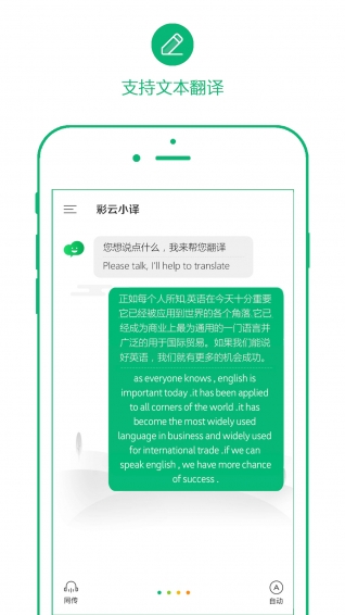 彩云小譯是北京彩徹區(qū)明科技有限公司開發(fā)的是一款手機(jī)翻譯應(yīng)用軟件,兼具中日英同聲傳譯、文檔翻譯和網(wǎng)頁翻譯功能。幫助用戶在工作、出國旅游、與外國友人聚會(huì)等場合解決語言障礙;擁有輸入任意網(wǎng)址瀏覽中英對(duì)照網(wǎng)頁的功能。彩云小譯為用戶提供便捷的實(shí)時(shí)翻譯功能。用戶只需戴上耳機(jī),開啟同聲傳譯,橫屏模式,讓交流更順暢。