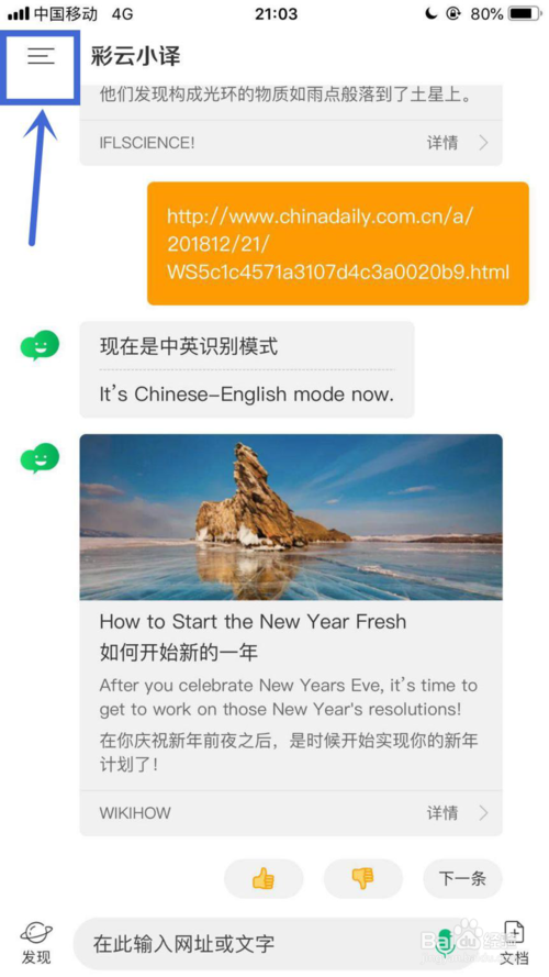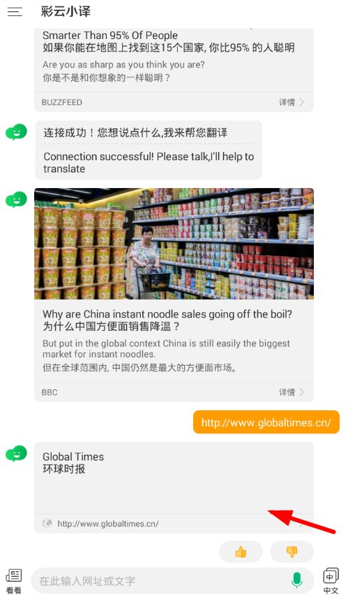 2、然后在發(fā)送了網(wǎng)址之后,就會(huì)出現(xiàn)一個(gè)彩云小譯的回復(fù),點(diǎn)擊進(jìn)入英文網(wǎng)頁中。