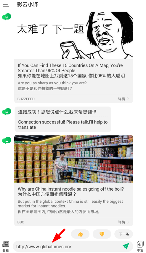 5.新增「看看」功能:輸入“看看”,小譯會(huì)推薦中英對(duì)照的國外知名網(wǎng)站精選內(nèi)容