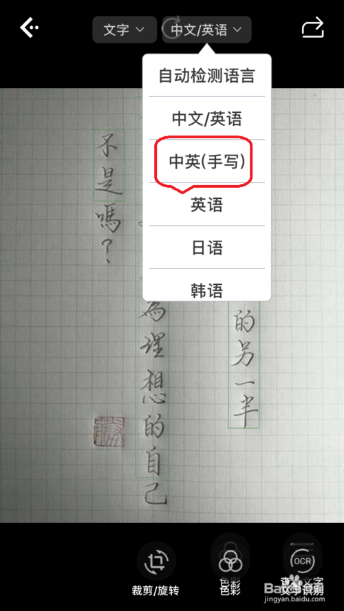 點擊上方語言選擇下拉框,根據(jù)實際需要選擇識別語言,比如下圖所示的“中英(手寫)”識別。