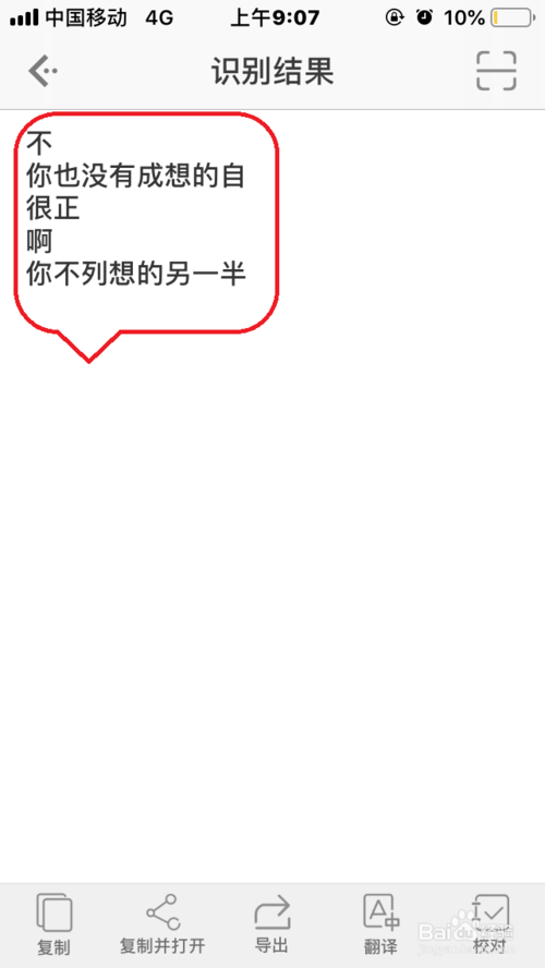 4、在掃描結(jié)果中,為大家提供了“復(fù)制”、“復(fù)制并打開”、“翻譯”、“校對”等功能,大家可先進(jìn)行校對,查看準(zhǔn)確度,然后可進(jìn)行復(fù)制,或者是翻譯,翻譯可翻譯成多種語言,比如英語,翻譯如下,翻譯之后點擊翻譯框左邊復(fù)制按鈕,可便捷復(fù)制翻譯的內(nèi)容。