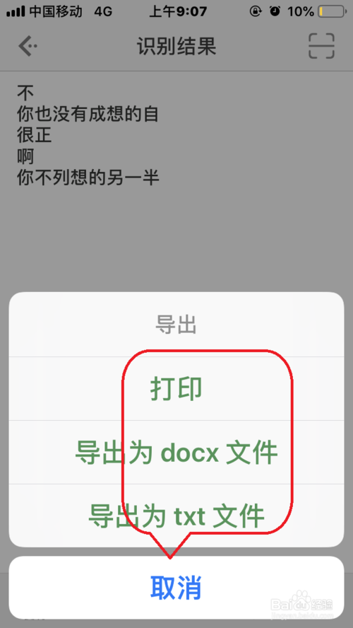 點擊底部“導(dǎo)出”,根據(jù)實際需要選擇“打印”、“導(dǎo)出為DOCX文件”、“導(dǎo)出為“TXT”文件,即可將識別的文字導(dǎo)出。