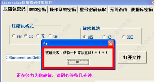 如果提示提示“破解失敗,請(qǐng)換一種方法重試!”的話,則需要在第二步中更換解密算法