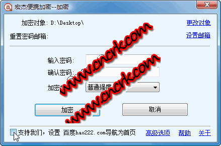 宏杰便攜文件夾加密軟件是一款高強(qiáng)度的文件夾加密軟件,可以方便地加密任意文件夾,并且支持U盤(pán)加密,移動(dòng)硬盤(pán)加密. 本軟件界面簡(jiǎn)潔,操作簡(jiǎn)單,功能強(qiáng)大,性能超群,是保障您數(shù)據(jù)安全的最佳加密軟件。 該軟件僅僅只有一個(gè)可執(zhí)行文件,使得使用非常方便。