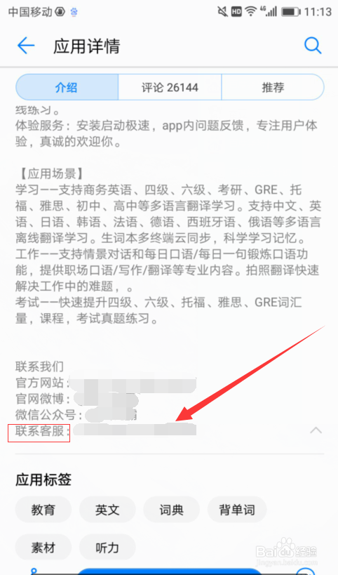 5.在應(yīng)用介紹按鈕最底下找到"金山詞霸"的客服聯(lián)系方式,如圖所示,請(qǐng)讀者自己按照步驟去尋找這個(gè)過(guò)程,并打客服電話,按照提示操作即可聯(lián)系“金山詞霸”的客服~