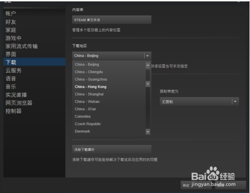 1、點擊steam窗口左上角的Steam - 設(shè)置 - 下載在這里可以內(nèi)容庫(下載目錄)的文件夾位置,以及下載地區(qū)(下載服務(wù)器)。