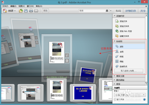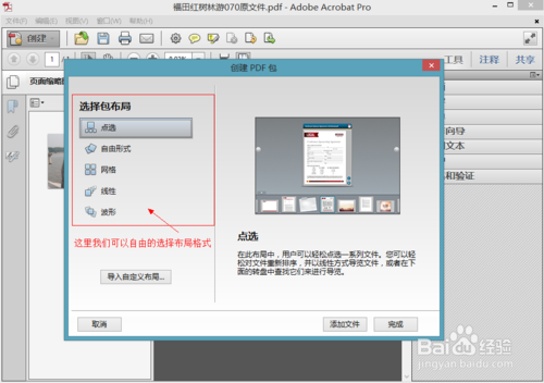 創(chuàng)建PDF包:將各種類型的文件合并到一個(gè)布局精致的PDF包中,這里軟件提供了5種布局方式任我們選擇:點(diǎn)選、自由形式、網(wǎng)格、線性、波形。
