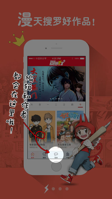 致力于原創(chuàng),用國漫成就經(jīng)典,著重于內(nèi)容,用作品打造品牌。我們希望我們的平臺(tái)不僅能成為云集漫畫界良心之作的殿堂,更能成為展示漫畫家生花妙筆的舞臺(tái)。它懂少年的情懷,也懂少女的情懷,它更懂漫畫的情懷,它是一款有情懷的漫畫平臺(tái)。