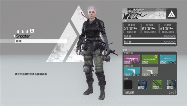 2.一進入游戲,要先選擇預(yù)設(shè),主要用槍的「Shooter」,或是使用斧頭大刀等的近戰(zhàn)「Fighter」,男女共 4 人可以選擇。隨后會傳送到白底大廳,出發(fā)前可以先在大廳內(nèi)熱身一下,練習(xí)基本的動作。實際操作了一下可以發(fā)現(xiàn),本作的操作是承襲《合金裝備5》,有玩過系列游戲的人想必很快就可以習(xí)慣