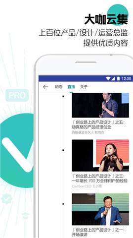 * 以直播講座/聽(tīng)課的方式,幫助產(chǎn)品經(jīng)理、設(shè)計(jì)師、運(yùn)營(yíng)學(xué)習(xí)技能、開(kāi)闊眼界。* 上百位產(chǎn)品總監(jiān)、設(shè)計(jì)總監(jiān)、運(yùn)營(yíng)總監(jiān)提供的優(yōu)質(zhì)內(nèi)容,幾乎覆蓋了 BAT 在內(nèi)的所有知名互聯(lián)網(wǎng)公司。