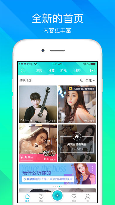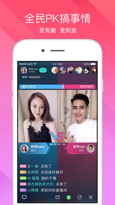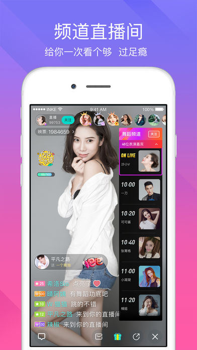 匯集千萬(wàn)粉絲,超過(guò)1000個(gè)明星藝人,5000個(gè)網(wǎng)絡(luò)紅人,10000個(gè)大學(xué)生,10萬(wàn)個(gè)帥哥和美女,來(lái)自全球的華人和留學(xué)生、無(wú)數(shù)頂級(jí)美女主播全天24小時(shí)不間斷視頻直播,進(jìn)入直播間與偶像面對(duì)面互動(dòng),你的ta從未如此真實(shí),如此靠近你