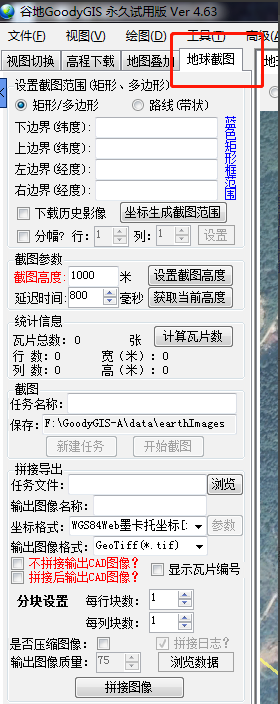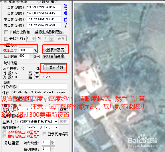 設(shè)置截圖高度,數(shù)值約小,圖片越清晰。然后點(diǎn)擊“計(jì)算瓦片數(shù)量”。注意:試用版的谷歌地球,瓦片數(shù)量不能超過300,超過300要重新設(shè)置截圖高度。