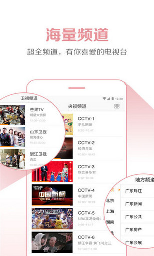 追看熱門電視?。簾o論韓劇、港劇、美劇、日劇還是國產電視連續(xù)劇,只要在電視臺播出,都能讓你更快的追看。萬一錯過直播,還支持三天之內的節(jié)目回放,精彩劇情一集不落。看直播 :既有中央電視臺、浙江衛(wèi)視、東方衛(wèi)視、江蘇衛(wèi)視、湖南衛(wèi)視等各大衛(wèi)視頻道的在線直播,一秒換臺不卡頓,高清頻道更流暢,時移回看新體驗!還有CIBN輪播頻道,四海釣魚、足球、勁爆體育等多個特色頻道,許多特色內容,等待著你來發(fā)掘,更有美女直播、特色輪播、特色資訊,頻道共計300+。