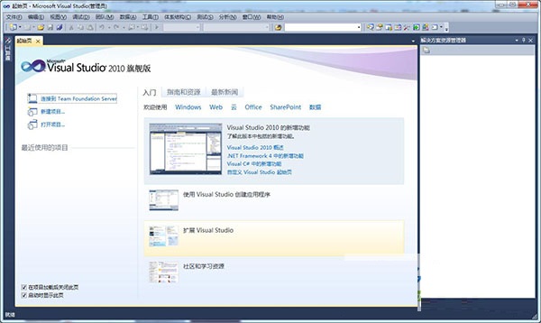 Visual Studio 2010 起始頁(yè)具有新外觀和新功能。選項(xiàng)卡式內(nèi)容區(qū)域可鏈接到各種選定和分類學(xué)習(xí)資源。這包括 MSDN 資源、社區(qū)資源和可自定義的新聞源。通過(guò)改進(jìn)的“最近的項(xiàng)目”列表,只需單擊鼠標(biāo)便可在該列表中添加或移除項(xiàng)目。還可以從擴(kuò)展管理器安裝自定義起始頁(yè)。