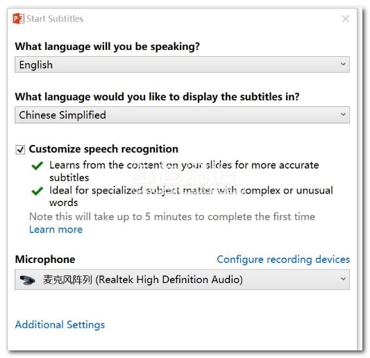 演講者可以選擇自定義語(yǔ)音識(shí)別引擎,讓PresentationTranslator學(xué)習(xí)幻燈片內(nèi)所提及的術(shù)語(yǔ)、產(chǎn)品或地名等專有詞匯,從而提高語(yǔ)音識(shí)別的準(zhǔn)確性。