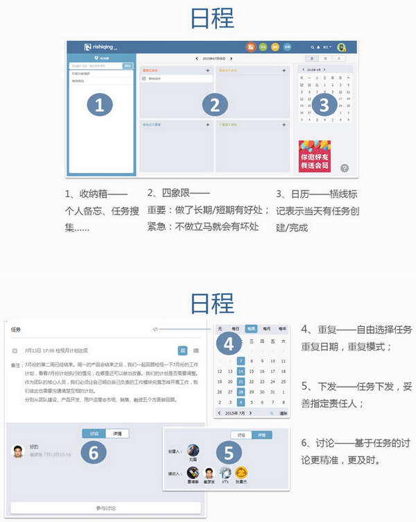 日程:收納箱、四象限、日歷、重復、下發(fā)、討論