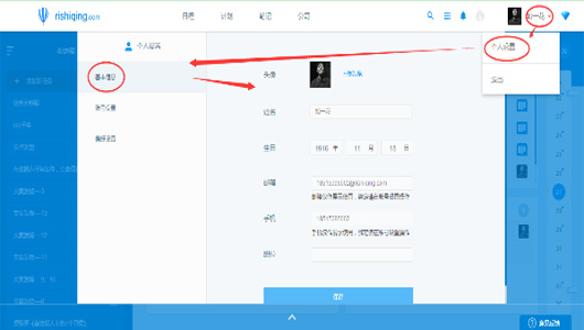 點擊用戶名(如圖則為‘如一花’)——>個人設置——>基本信息??梢陨蟼鲗儆谀阕约旱膫€性頭像,填寫你的姓名,生日,職位,填寫完成后點擊保存即可。郵箱和手機號只是顯示,不在此做綁定。