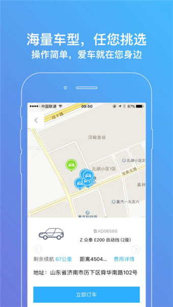 全稱手機控車(尋車、車門開關(guān)、閃燈鳴笛,車輛位置導(dǎo)航)根據(jù)用戶用車時間自動進行分時日租轉(zhuǎn)化,為用戶挺最便宜最便利的出行服務(wù)。