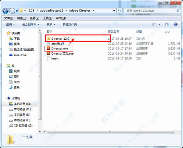 4、最后我們?cè)谀夸洝癈:\Program Files (x86)\Adobe”中找到我們剛剛放進(jìn)去的Director 12.0文件夾,打開(kāi)找到Director.exe程序雙擊即可運(yùn)行;