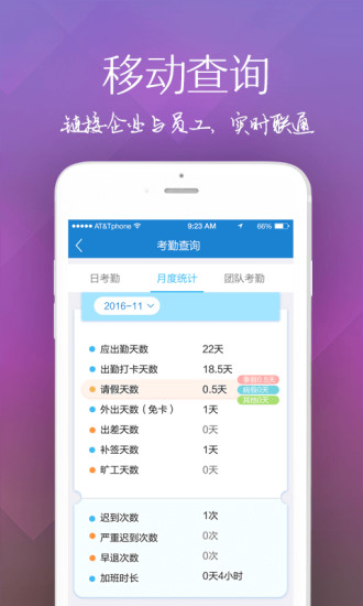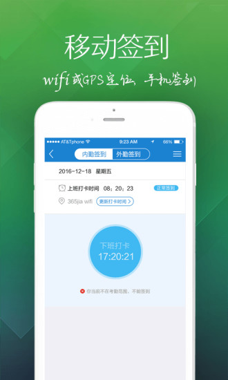 【移動簽到】:支持WIFI、GPS手機定位考勤,員工輕松簽到【假勤審批】:請假、出差、外出、加班、補簽隨時隨地提交及審批