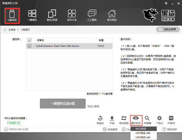 第八步:U盤(pán)到這里就制作完成了。如果想要知道U盤(pán)制作是否成功,可以在U盤(pán)模式下,打開(kāi)右下角的模擬啟動(dòng),選擇BIOS啟動(dòng)。