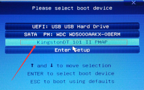 此時(shí)請(qǐng)大家選擇帶有USB字樣的或是選擇你的U盤(pán)名稱,點(diǎn)擊之后,會(huì)有一個(gè)黑色屏幕的選項(xiàng)界面,一般選擇第一個(gè)選項(xiàng)即可。