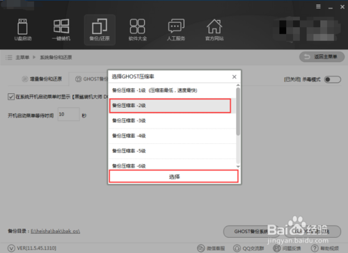 選擇GHOST壓縮率,推薦選擇備份壓縮率2級(jí),那樣備份較快。選擇完成后,黑鯊會(huì)自動(dòng)下載PE鏡像,添加到開(kāi)機(jī)啟動(dòng)項(xiàng)。