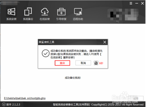然后黑鯊裝機(jī)工具會(huì)幫你全自動(dòng)安裝,安裝過(guò)程中請(qǐng)保持通電正常,不要隨機(jī)關(guān)機(jī)或者打開(kāi)其他軟件。完成之后點(diǎn)擊重啟。